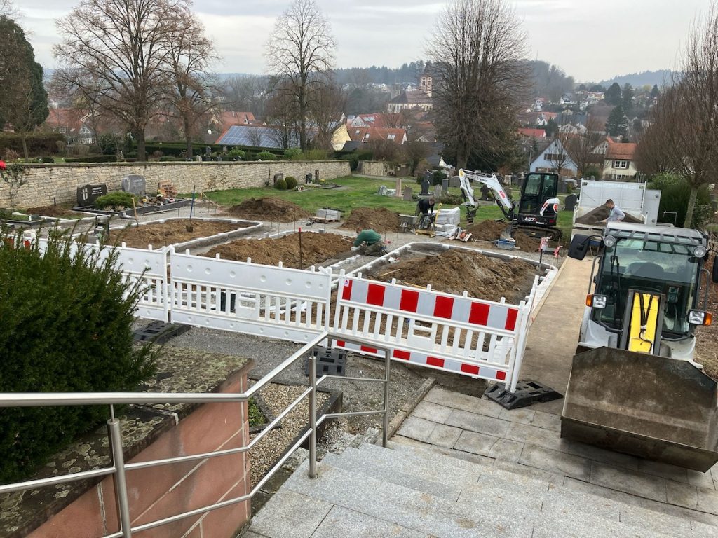 Bis Ostern entsteht auf dem Gondelsheimer Friedhof eine neues Grabfeld in einer parkähnlichen Umgebung. 200 Quadratmeter direkt unterhalb der Aussegnungshalle stehen dafür zur Verfügung, mit der Möglichkeit einer späteren Erweiterung der Fläche. Mindestens 41 Ruhestätten sind dort vorgesehen. „Die Nachfrage ist bereits jetzt sehr hoch, obwohl wir die Flächen noch gar nicht vergeben können“, sagt Bürgermeister Markus Rupp und erklärt den Hintergrund: „Viele wünschen sich für ihr Gedenken an Angehörige eine liebevoll gestaltete, naturnahe Grabstätte.“ Deshalb ist die professionelle Grabpflege ein fester Bestandteil dieses Grabfelds für die komplette Laufzeit. Letztere beträgt für Erdgräber 25 Jahre und für die Urnengräber 15 Jahre.