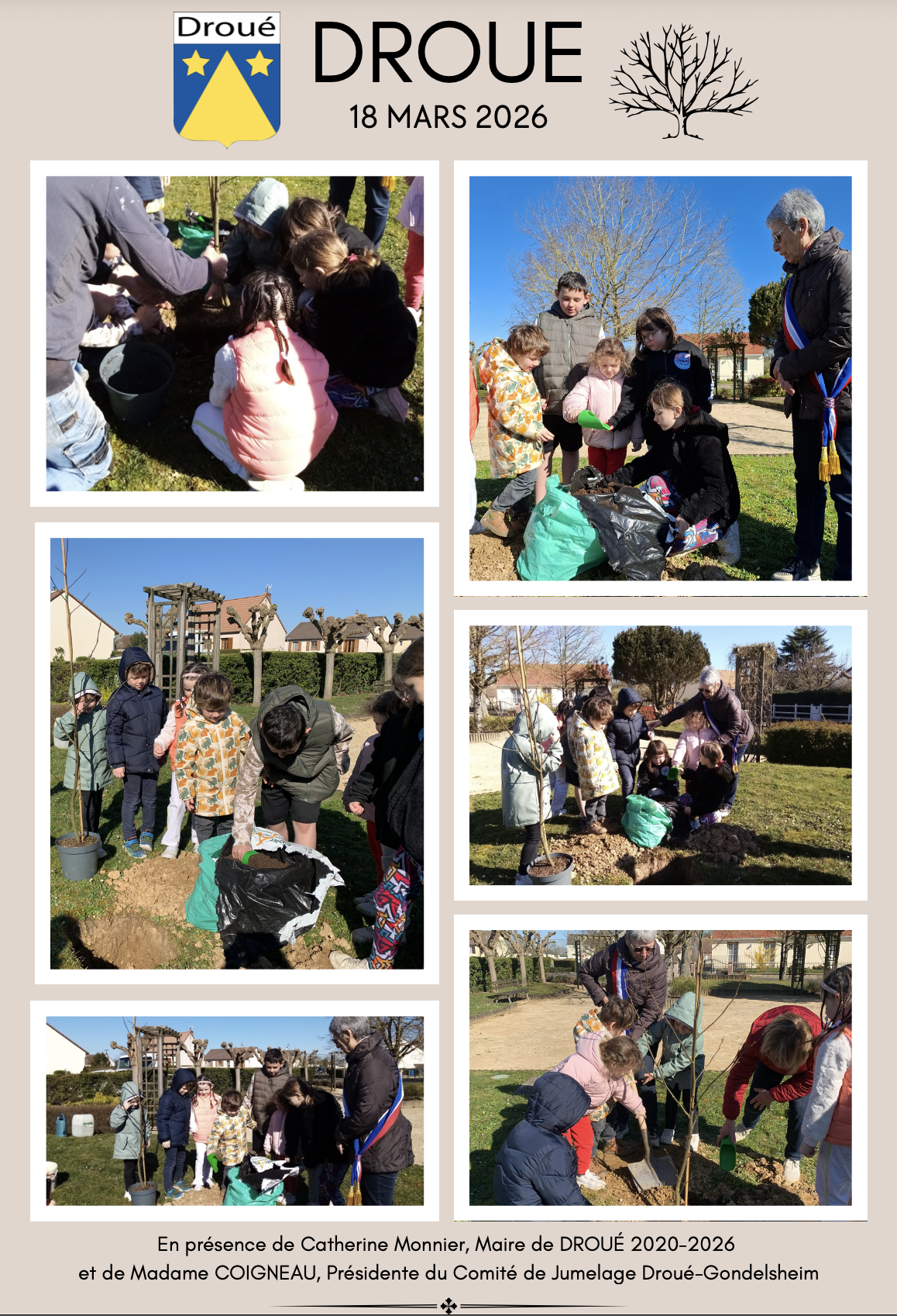 In Droué pflanzten die Noch-Bürgermeisterin Catherine Monnier, die in wenigen Tagen aus dem Amt ausscheiden wird, gemeinsam mit Marie-Claude Coigneau, der Vorsitzenden des Partnerschaftsausschusses auf französischer Seite bei bestem Wetter einen wunderschönen Baum der Partnerschaft auf dem Place de Gondelsheim.