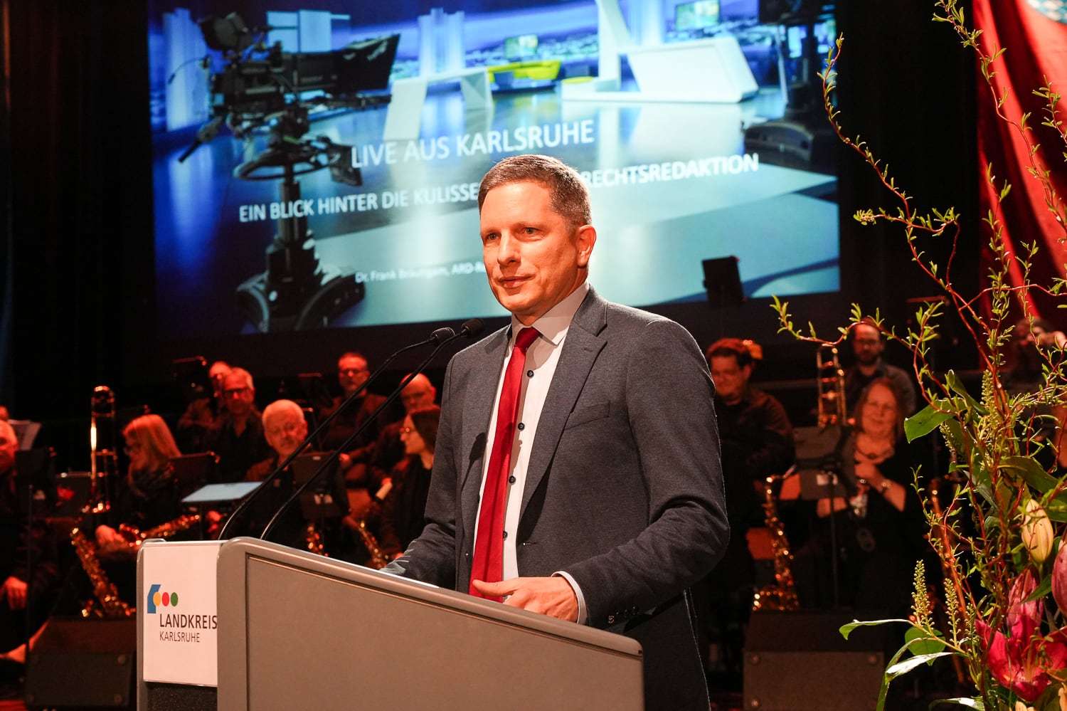 Dass an Dr. Christoph Schnaudigel abseits seines politischen Wirkens ein passabler Showmaster verloren gegangen ist, bewies er bei der Begrüßung der mehreren hundert Gäste. Mit Charme, Wortwitz und der berühmten Schnaudigelschen Nonchalance läutete er einen Abend ein, dessen Zeitplan quasi mit dem ersten Gong über den Haufen geworfen wurde. Aus aktuellem Anlass verzögerte sich die Ankunft des Hauptredners Dr. Frank Bräutigam, Leiter der ARD-Rechtsredaktion, um ein beträchtliches Stück. Vor der Kür kommt bekanntlich die Pflicht – und eine spontane Live-Schaltung aus dem SWR-Studio in der Karlsruher Kriegstraße zur Tagesschau nach Hamburg machte den vollen Einsatz von Bräutigam unabdingbar. Das Landratsamt bewies jedoch Improvisationstalent und streamte die Nachrichten kurzerhand live auf die Leinwand im Bürgerzentrum. So kam es zur absurden Situation, dass hunderte Menschen gemeinsam die Tagesschau verfolgten, inklusive der obligatorischen Werbung für Gürtelrose-Prophylaxe. Wie rasant der Alltag eines Journalisten sein kann, zeigte sich hier eindrücklich: In einem Moment gibt ARD-Jurist Frank Bräutigam noch seine Einschätzung zu komplexen KI-Deepfakes im Kielwasser der aktuellen Diskussion um den Fall Ulmen ab, im nächsten steht er bereits in Bruchsal auf der Bühne und gibt Einblicke in seine spezialisierte Redaktion.