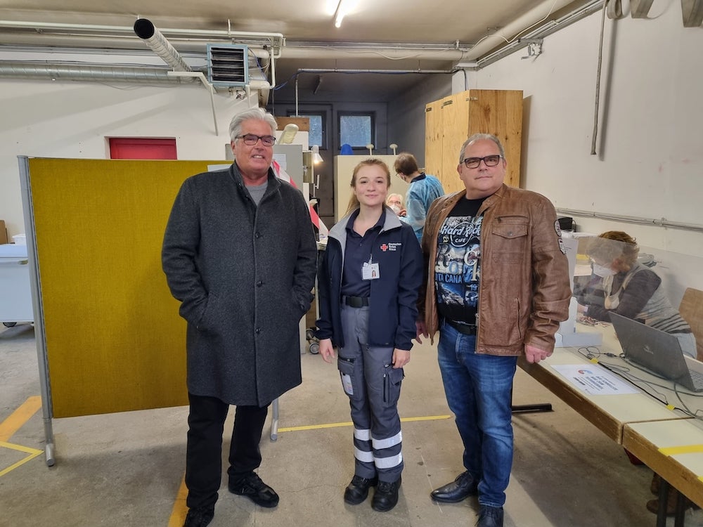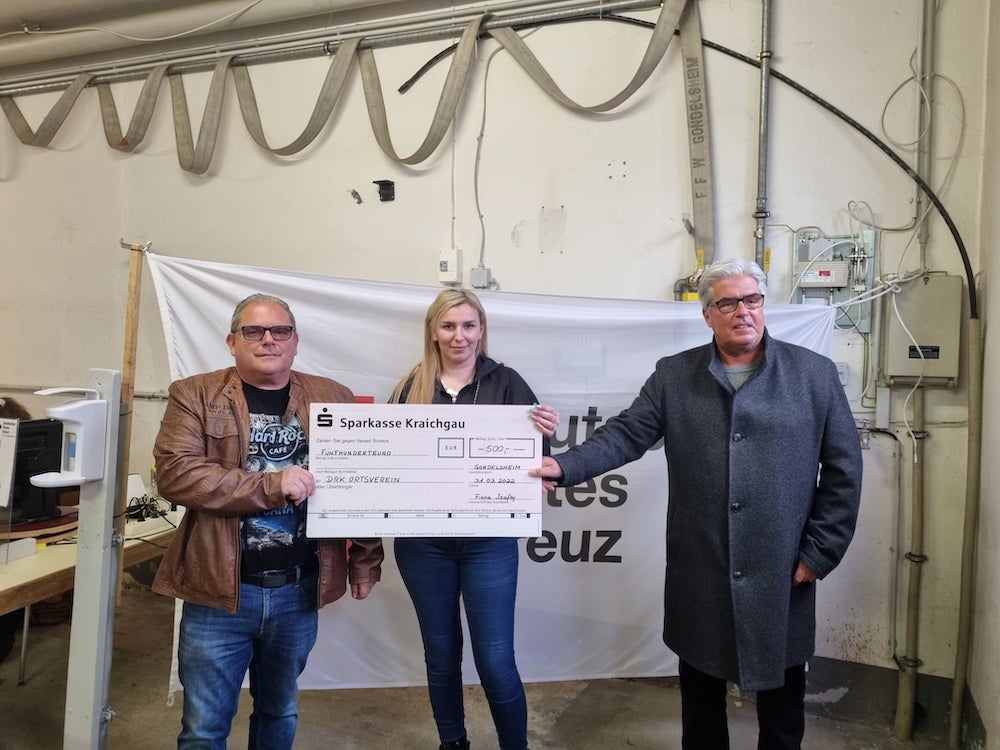 Und als weiteres Highlight hat Frau Fiona Isufaj von der privaten Teststelle in der Bahnhofstraße dem DRK Vorsitzenden Claus Steinbach einen Scheck in Höhe von 500 Euro für den Ortsverein überreicht.