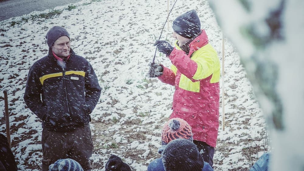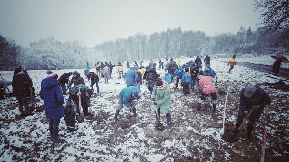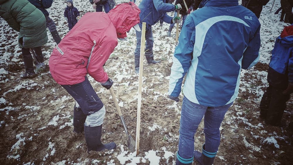 Ausgerüstet mit Spaten, Schaufel und wetterfester Kleidung gruben die Menschen unter der fachkundigen Anleitung von Dr. Simon Boden und Fabian Barthold vom Karlsruhe Landratsamt Löcher für ihr jeweiliges Bäumchen in den eiskalten Grund.