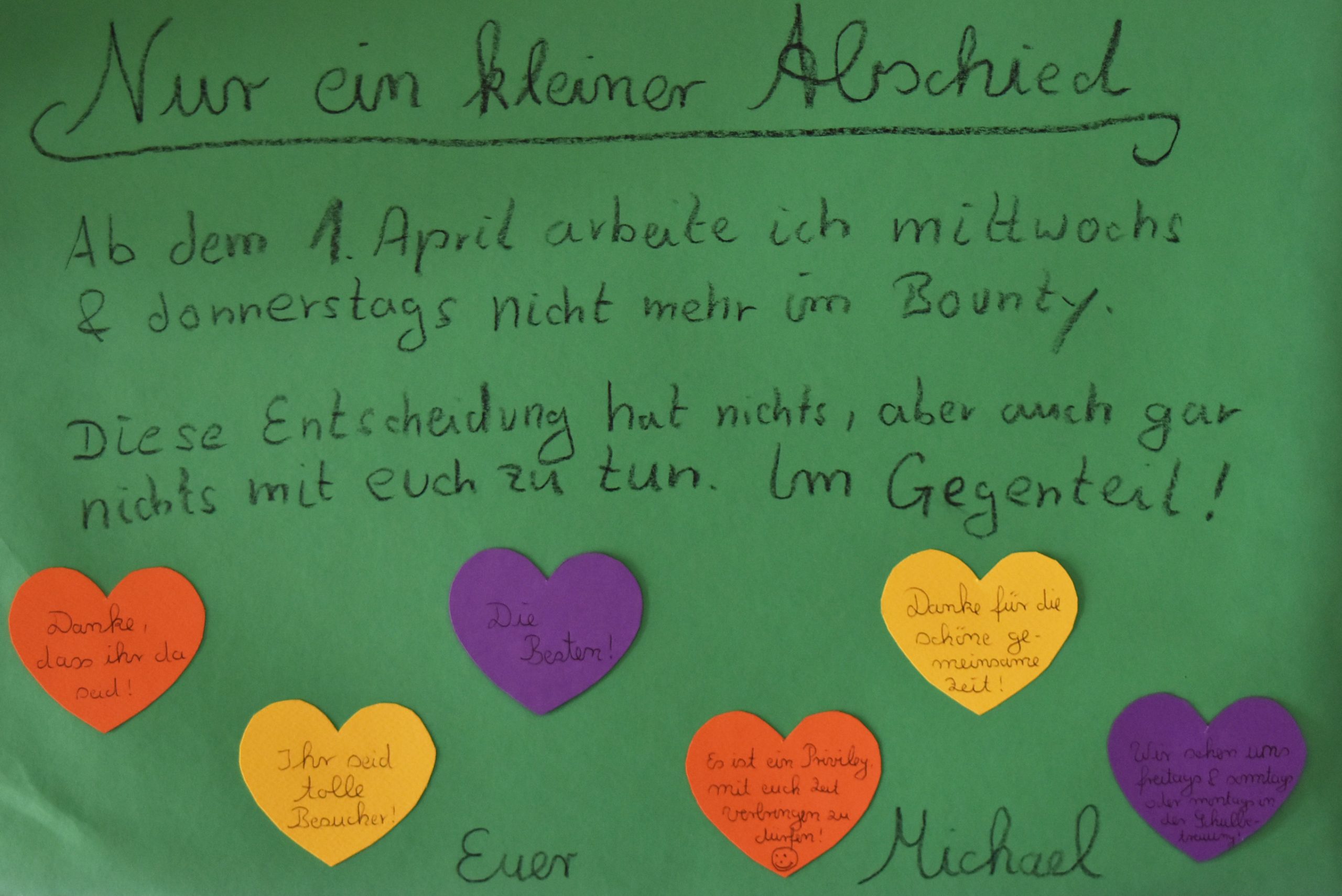 Ab dem 1. April wird Michael wegen persönlicher Gründe nicht mehr mittwochs und donnerstags im »Bounty« arbeiten. Er bleibt dem Jugendtreff aber als Einrichtungsleitung erhalten und wird weiterhin Aktionen durchführen, sowie montags, freitags und sonntags auch unsere Gäste betreuen. Wie er in einem persönlich an unsere Besucher gerichteten Plakatbrief schrieb: „Diese Entscheidung hat nichts, aber auch gar nichts mit euch zu tun. Im Gegenteil!“