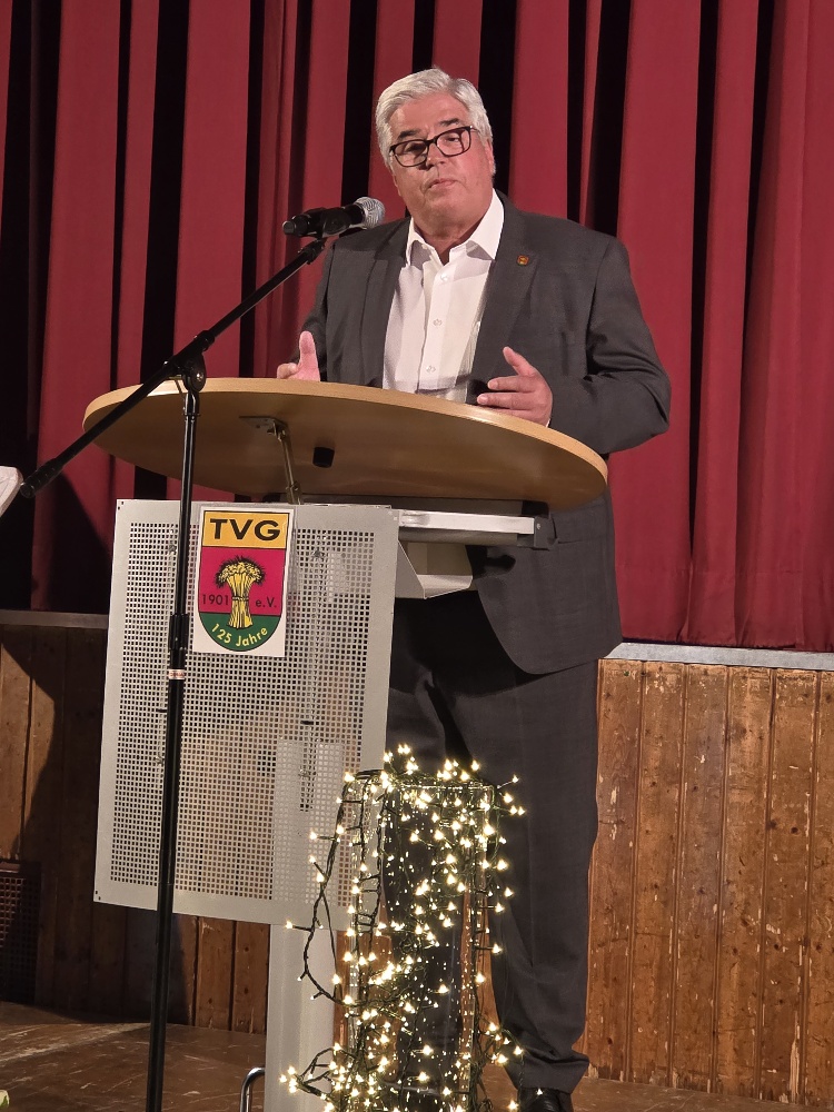 Bürgermeister Markus Rupp hielt eine Laudatio unter dem Titel „125 Jahre Turnverein – ein Verein im Wandel der Zeit“ und würdigte die kontinuierliche Entwicklung des Vereins sowie dessen zentrale Rolle im gesellschaftlichen Leben der Gemeinde.