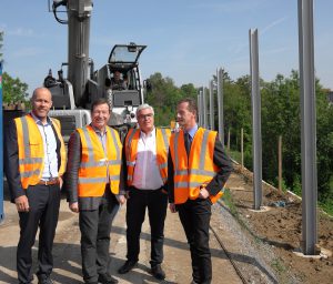 Bildunterschrift (v.l.): Alexander Klöcker, Geschäftsführer Reif Bauunternehmung; Thomas Marwein, Lärmschutzbeauftragter der Landesregierung; Bürgermeister Markus Rupp; Jürgen Genthner, Referatsleiter Regierungspräsidium