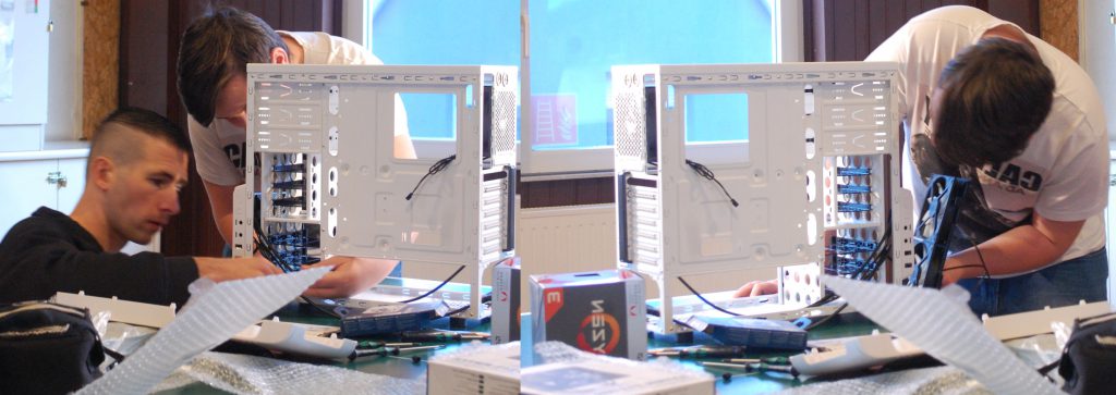 „Einen PC zu bauen ist nicht schwer, ihn einzurichten aber sehr.“ Nach diesem Motto wagten wir uns an ein kleines, aber feines technisches Projekt. Es galt, unseren alten, ziemlich in die Jahre gekommenen und bereits arg bockenden, stockenden Jugend-PC-Internet-Rechner durch einen neuen Computer zu ersetzen. Warum diesen also nicht selbst bauen? Also orderten wir die verschiedenen Komponenten und ein technisch beflissenes / interessiertes Team machte sich an einem ruhigen Montagnachmittag an die etwa drei Stunden lange Arbeit, die einzelnen Teile richtig zusammenzusetzen. Das Mainboard musste mit Speichermodulen und SSD-Festplatten bestückt, die Verkabelung richtig angeschlossen, das Netzteil verbaut und die Lüfter richtig gesetzt werden. Fingerspitzengefühl und etwas Bastelei war beim Aufsetzen des Prozessorkühlers vonnöten, denn hier fehlte eine gute Anleitung und wir mussten uns durch eigene Logik helfen. Schließlich konnten wir das Gehäuse aber doch schließen und als wir dem neuen Rechner zum ersten Mal Strom zuführten, sprangen die Ventilatoren an, die Power-LEDs leuchteten, es fiepte und piepte. Nur allzu viel sehen konnten wir noch nicht. Denn ohne Betriebssystem und Programme ist mit so einem technischen Wunderwerk doch recht wenig anzufangen. Die eigentliche, die große Arbeit, das Einrichten des Rechners, muss also erst noch erfolgen. Dennoch blickten die Techniker mit Stolz auf den erfolgreichen Abschluss des Hardwareprojektes.