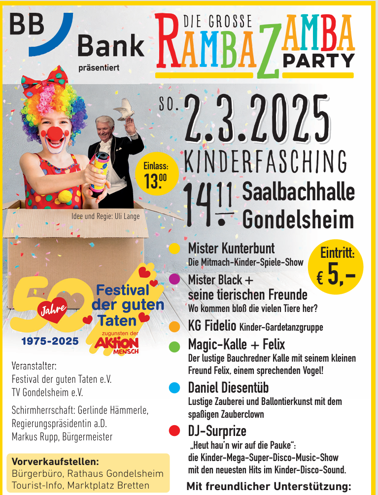 Das bunte Event, organisiert von Uli Lange (Bretten) und seinem Kuratorium „Festival der Guten Taten“ sorgte in den Vorjahren stets für eine volle Saalbachhalle in Gondelsheim. Lange hat wieder ein abwechslungsreiches Programm auf die Beine gestellt, das Musik, Spiele und kreative Aktivitäten für unsere Kleinen umfasst.