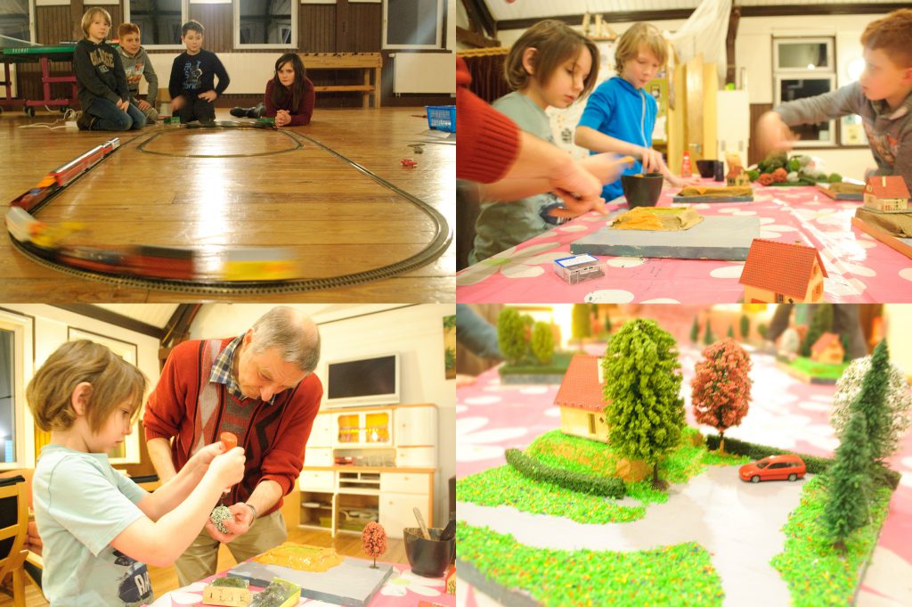 Während wir Abend für Abend die Gleise einer Fleischmann H0-Bahn zusammensteckten und so auf dem Boden zwei fahrbare Kreise aufbauten, wurde gleichzeitig an den Modulen gearbeitet. Jedes Kind gestaltete seine eigene, ganz individuelle Vision einer Landschaft. Zur Verfügung standen hierfür Elemente wie Krepppapier, Modellbau-Mörtel, Leim, Streusand, Bäume, Hecken und jeweils ein Haus und ein Auto.